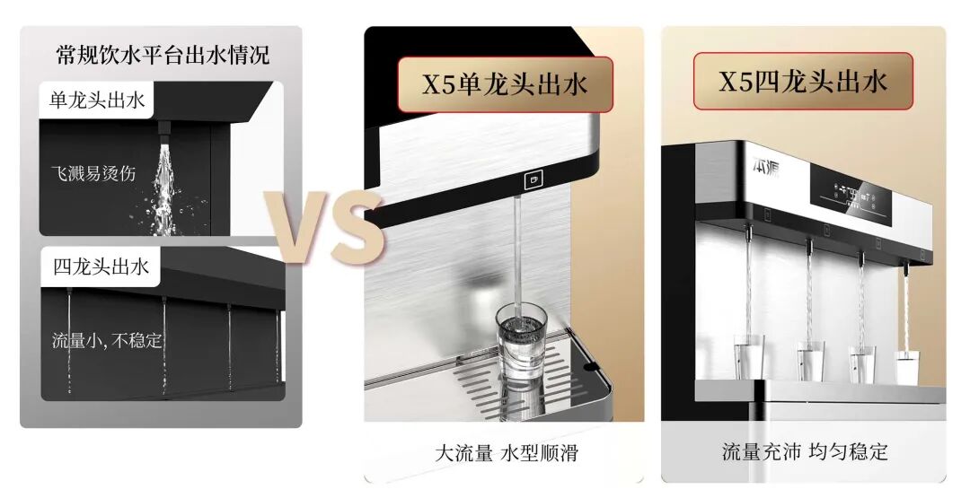 专为中小学课间高峰设计,解决传统设备,多人同时接水流量衰减、水温不稳的痛点: